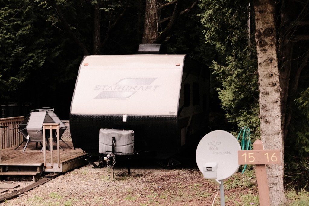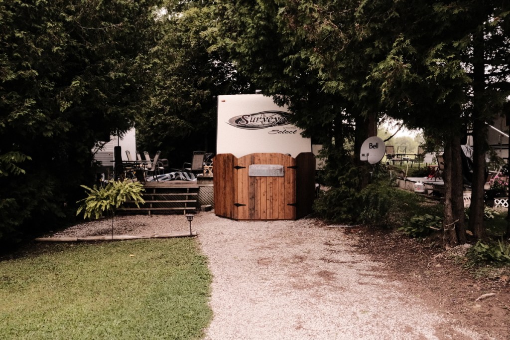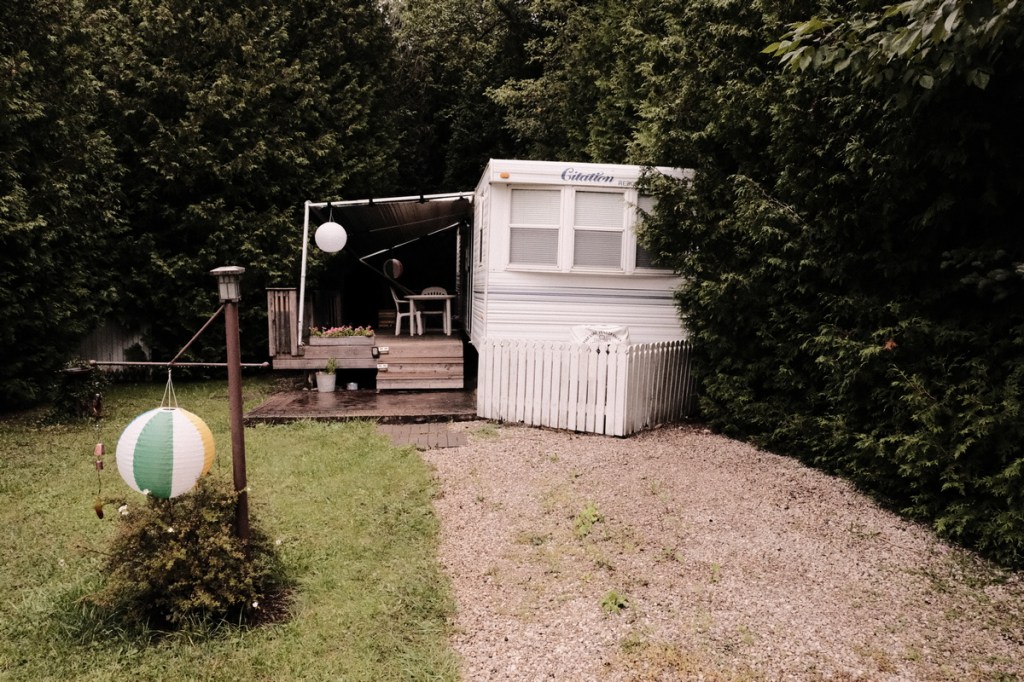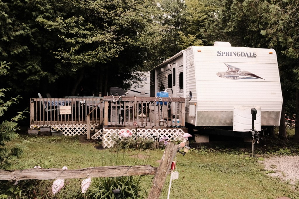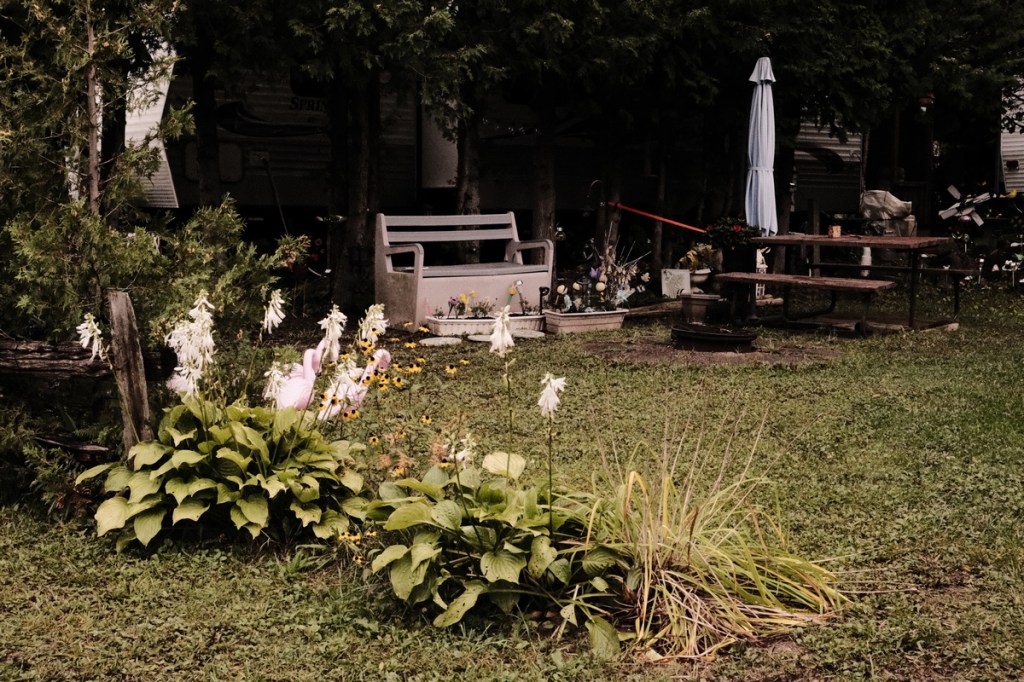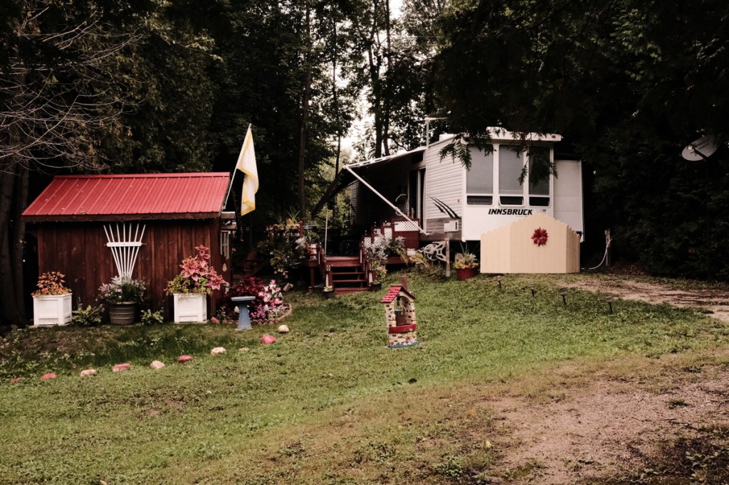 These pictures were taken the week after Labour Day here in Ontario. For about the only time this summer the weather was gloomy and wet, lending the quiet camp even more of an air of damp. But in between the old and fading trailers, alongside the camp shop and pool, now closed because of the restrictions imposed by the fight against Covid-19, look closely and you’ll find sites that have been lovingly tended, decorated with plants, plastic animals, signs and lawns. While there are sites that look neglected, abandoned, there are places that people will come back to year after year, spending summers in the open air away from the suburbs or towns where they live. Maybe some of these people have similar sites in the US where they see out the cold Canadian winters, coming back to Ontario for our summer. There are stories behind each of these trailers, loved or neglected.