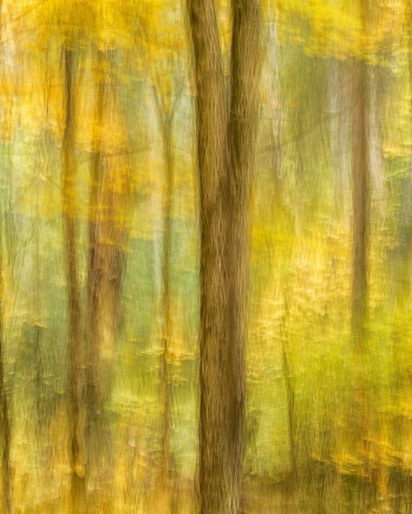Which brings me back to ICM. Intentional Camera Movement. The practice of moving the camera to an unspecified degree in an unspecified direction (or more than one) for an unspecified length of time (the exposure) and seeing what you get. To the classic exposure triangle of ISO, Aperture and Shutter Speed we are now adding a fourth variable, Motion or Direction. We are deliberately moving the camera while the shutter is open and our motion will determine what the image looks like. At the simplest, we can pan vertically among the trees and produce what is now becoming the classic ICM image.