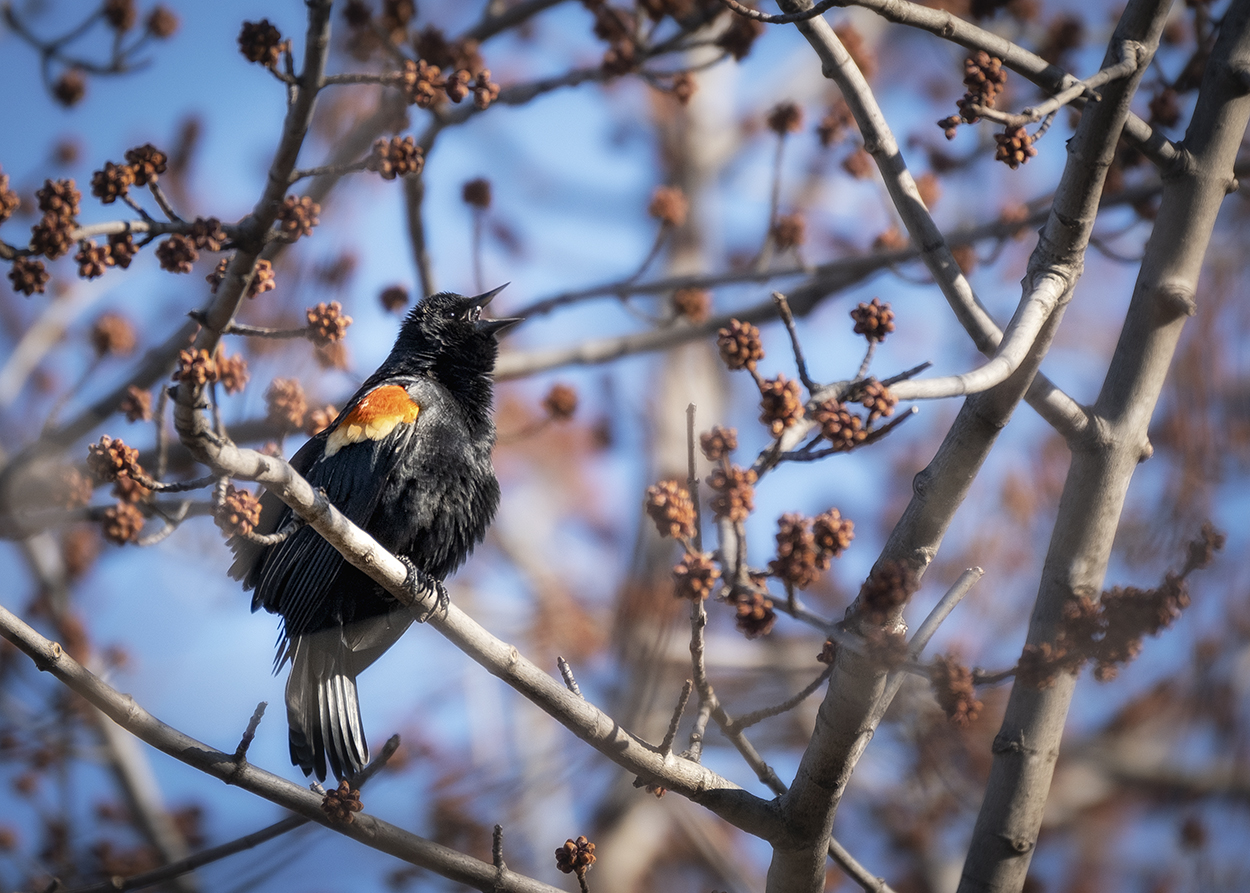 The Cardinals and Chickadees don’t go anywhere during Winter but now they’re being joined by the Cedar Waxwings, Red-Wing Blackbirds, European Starlings and Goldfinches. Before too long we’ll see the warblers passing through Southern Ontario during the Spring Migration and it will be a feast for photographers. I can’t wait.